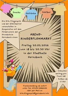 Am Freitag, den 20. Februar, veranstalten die Kita Fliegenpilz und der Elternbeirat in Kooperation mit dem Förderverein der Grundschule Gernsbach in der Stadthalle Gernsbach, Badener Str. 1, ihren ersten Abend-Second-Hand-Verkauf für Kinderartikel aller Art.