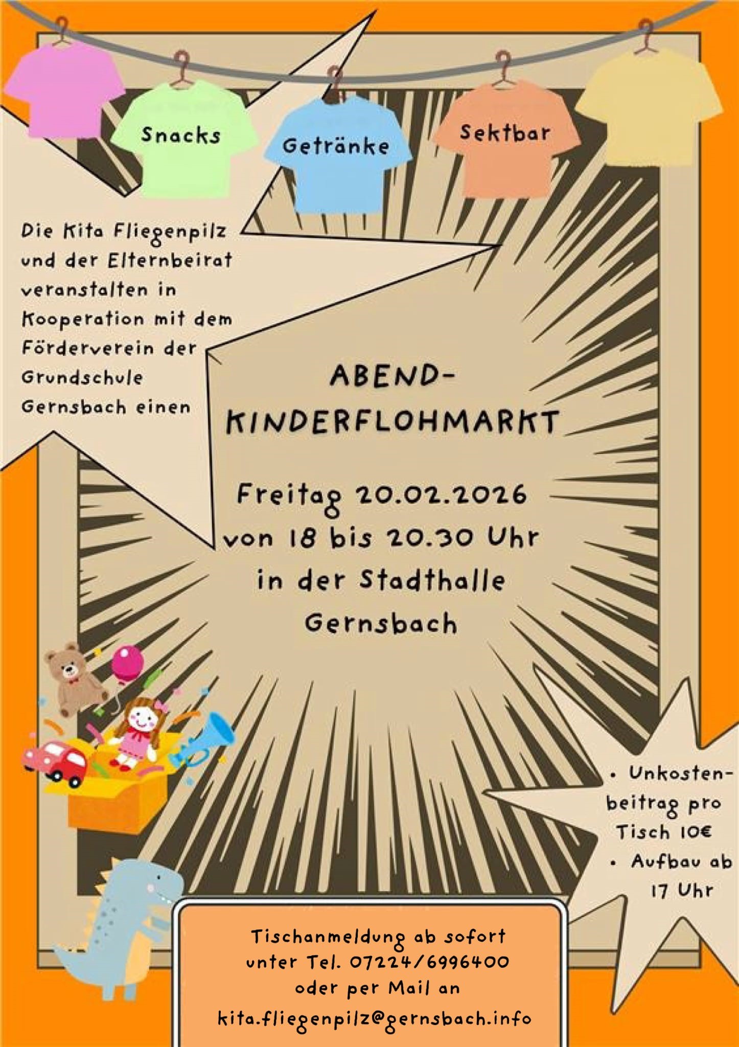 Ab sofort können Tische unter der Telefonnummer 07224 / 6996400 oder per Mail an kita.fliegenpilz@gernsbach.info in der Kita Fliegenpilz bis zum 20.02.26 zu den üblichen Kitazeiten reserviert werden. Der Unkostenbeitrag pro Tisch beträgt 10 €. Der erwirtschaftete Geldbetrag wird im vollen Umfang für die Kinder eingesetzt.