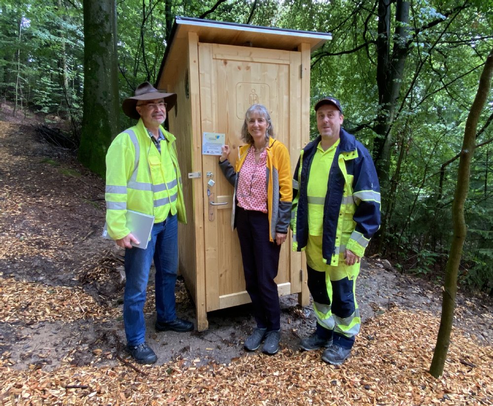 Die LEADER-Förderung für die Toilette wurde von der Stadt Gernsbach beantragt. Die Anschaffung übernahm die Stadt, während die Dorfgemeinschaft Scheuern mit großem Engagement den Aufbau vor Ort realisierte. Nun bringt der städtische Bauhof die offizielle LEADER-Plakette an und führt noch einige ergänzende Arbeiten am Wald-WC aus.