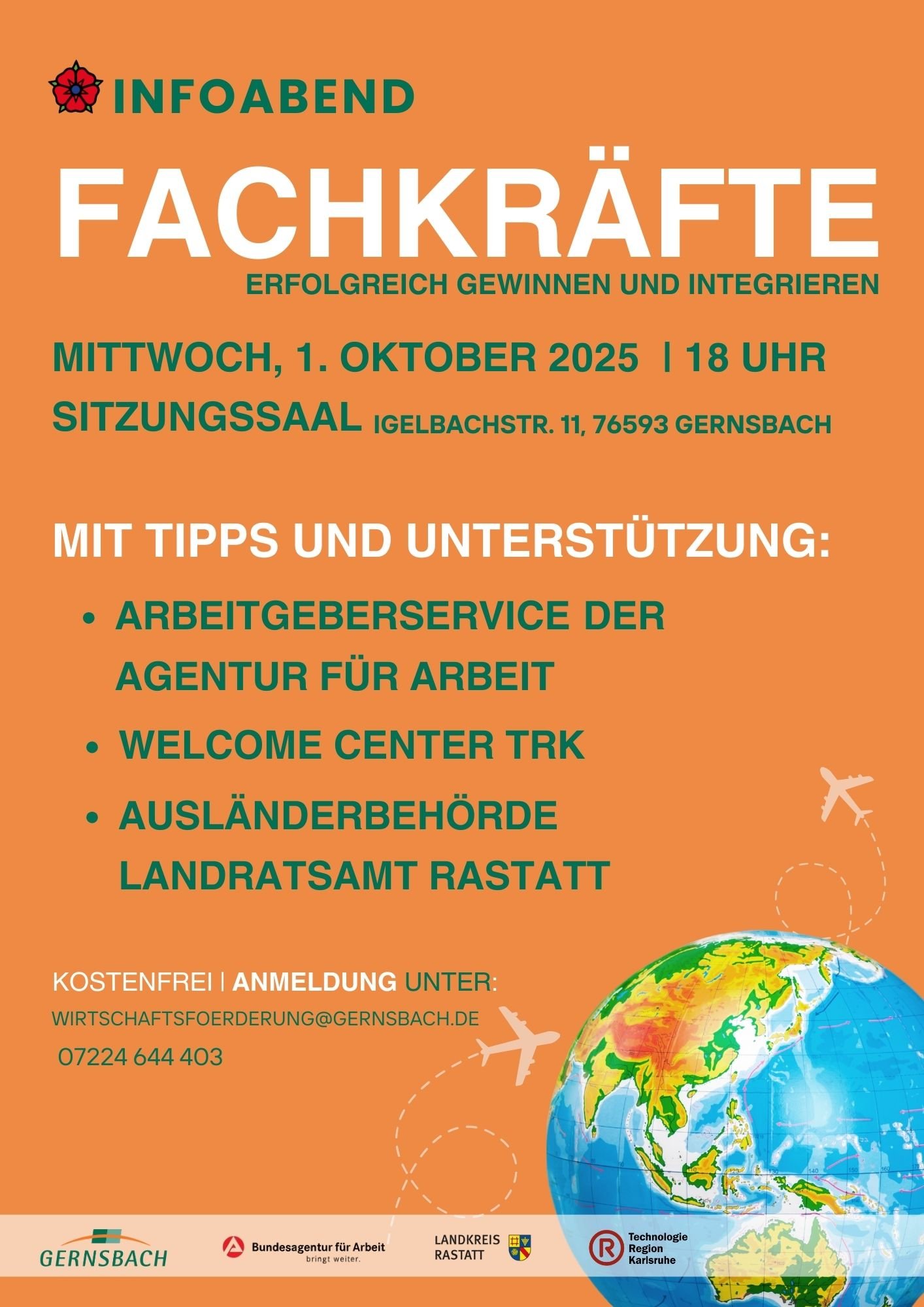Die für Mittwoch, 1. Oktober 2025, angekündigte Informationsveranstaltung der Wirtschaftsförderung Gernsbach zum Thema ‚Fachkräfte aus dem Ausland gewinnen‘ kann aufgrund zu geringer Anmeldungen nicht stattfinden.