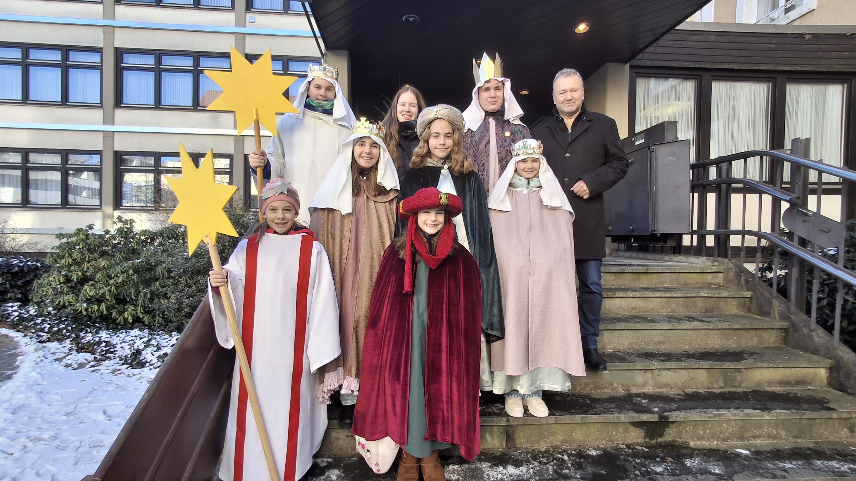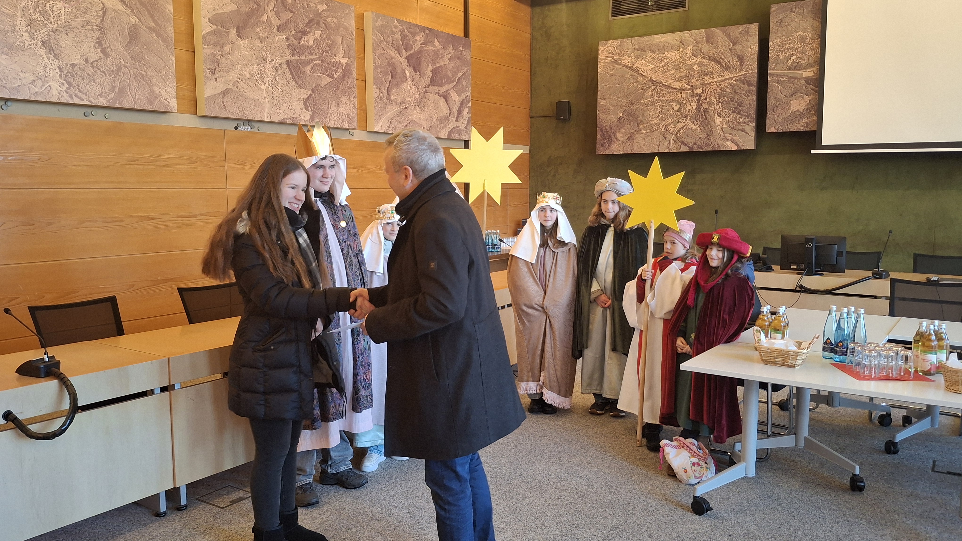 Bürgermeister-Stellvertreter Uwe Meyer begrüßte sieben Sternsinger und ihre Begleitpersonen und übergab ihnen eine Spende. „Es ist bemerkenswert, dass ihr eure Schulferien dazu nutzt, anderen jungen Menschen zu Bildung und damit zu besseren Zukunftsaussichten zu verhelfen“, richtete er seinen Dank an die jungen Engagierten. Gleichzeitig verwies er darauf, dass das Motto „Schule statt Fabrik“ den hiesigen Kindern auch aufzeige, wie gut es ist, dass es in Deutschland nicht nur die Pflicht, sondern auch das Recht auf Schulbesuch gibt.
