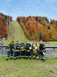 Auch bei einer weiteren Herausforderung, dem Schanzenlauf in Oberstdorf, zeigten die sechs Feuerwehrleute ihren Einsatz. Über 412 Meter, 1.000 Stufen und 162 Höhenmeter erklommen die Teilnehmer die Heini-Klopfer-Skiflugschanze mit angeschlossenem Atemschutzgerät und voller Schutzausrüstung. Atem und Ausdauer wurden dabei besonders gefordert.